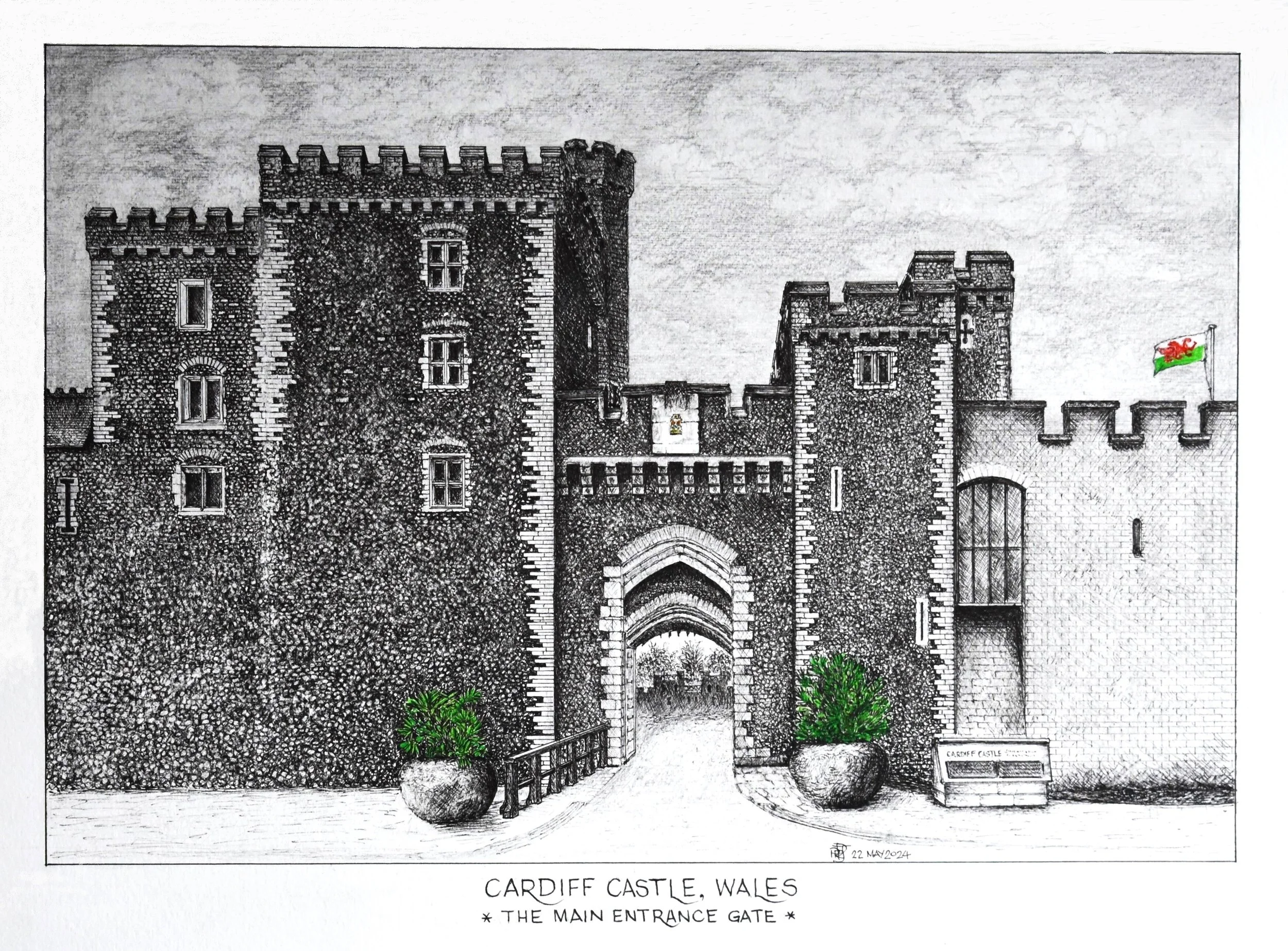 Cardiff Castle : This drawing of The Main Entrance Gate, was completed in 2024 from photos taken by Peter as well as frequent on-site visits, sometimes whilst relaxing with an ice cream at the ice cream parlour opposite the gate! The drawing took approx. 45 hours .